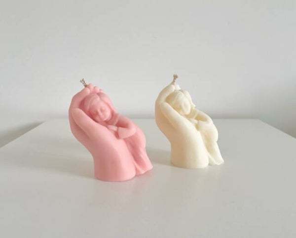 Hand gegoten* kaars in de vorm van een kindje liggend in een hand.