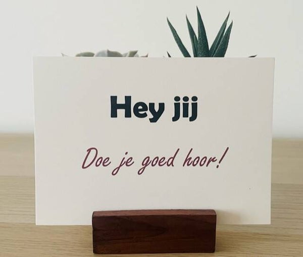 Crèmekleurige wens- affirmatiekaart.''Hey jijDoe je goed hoor!''Formaat: A6Materiaal: FSC- gecertificeerd papier* *Dit product is gemaakt met papier afkomstig uit een duurzaam beheerd bos.