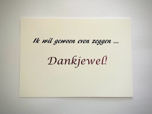 Crèmekleurige wens- affirmatiekaart.''Ik wil gewoon even zeggen ...Dankjewel!''Formaat: A6Materiaal: FSC- gecertificeerd papier* Gemaakt in België.*Dit product is gemaakt met papier afkomstig uit een duurzaam beheerd bos.