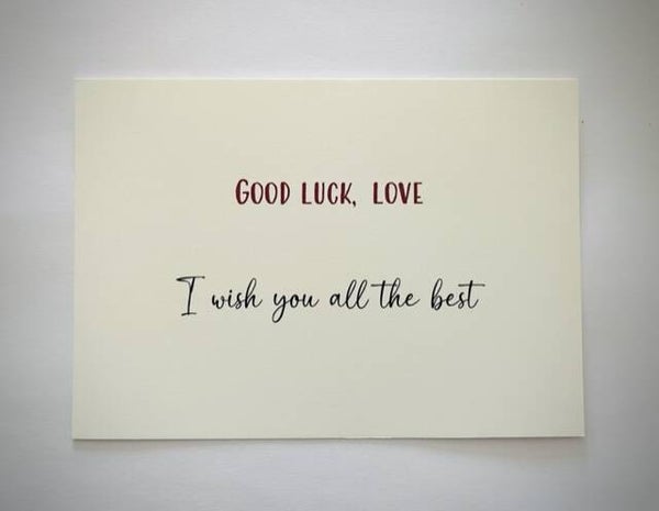 Crèmekleurige wens- affirmatiekaart.''Good luck, loveI wish you all the best''Formaat: A6Materiaal: FSC- gecertificeerd papier* *Dit product is gemaakt met papier afkomstig uit een duurzaam beheerd bos.